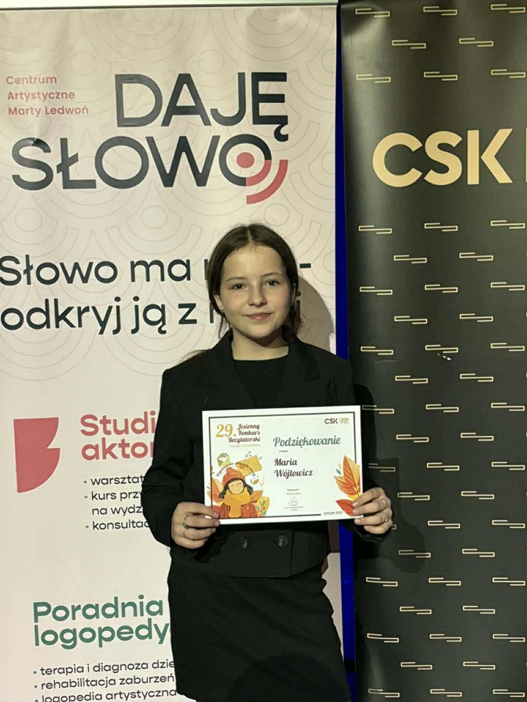 ,,Recytatorskie laury" 21 listopada w lubelskim Centrum Spotkania Kultur odbył się wojewódzki finał XXIX Jesiennego Konkursu Recytatorskiego, któremu w tym roku przyświecało hasło ,,Wspomnienia- pamiątki duszy ". Powiat krasnostawski (w kategorii klas IV- VI) reprezentowała nasza uczennica, Maria Wójtowicz z kl.VIb. Z Lublina wróciła z nagrodą!