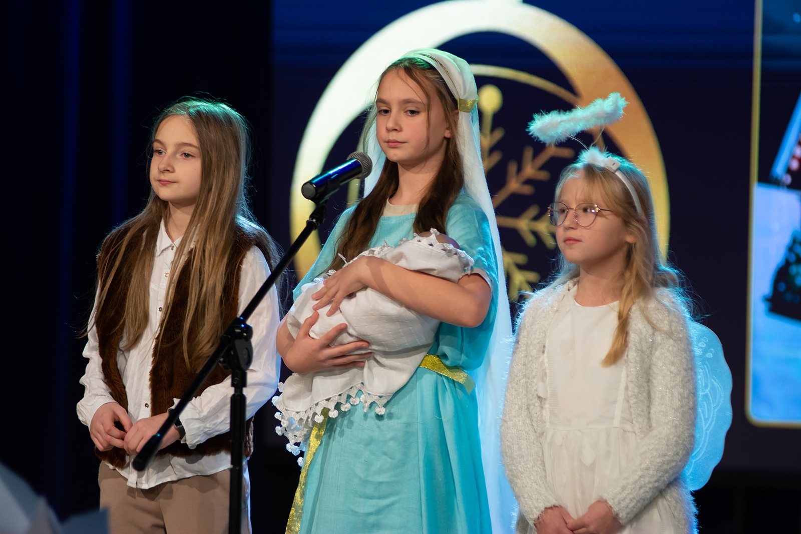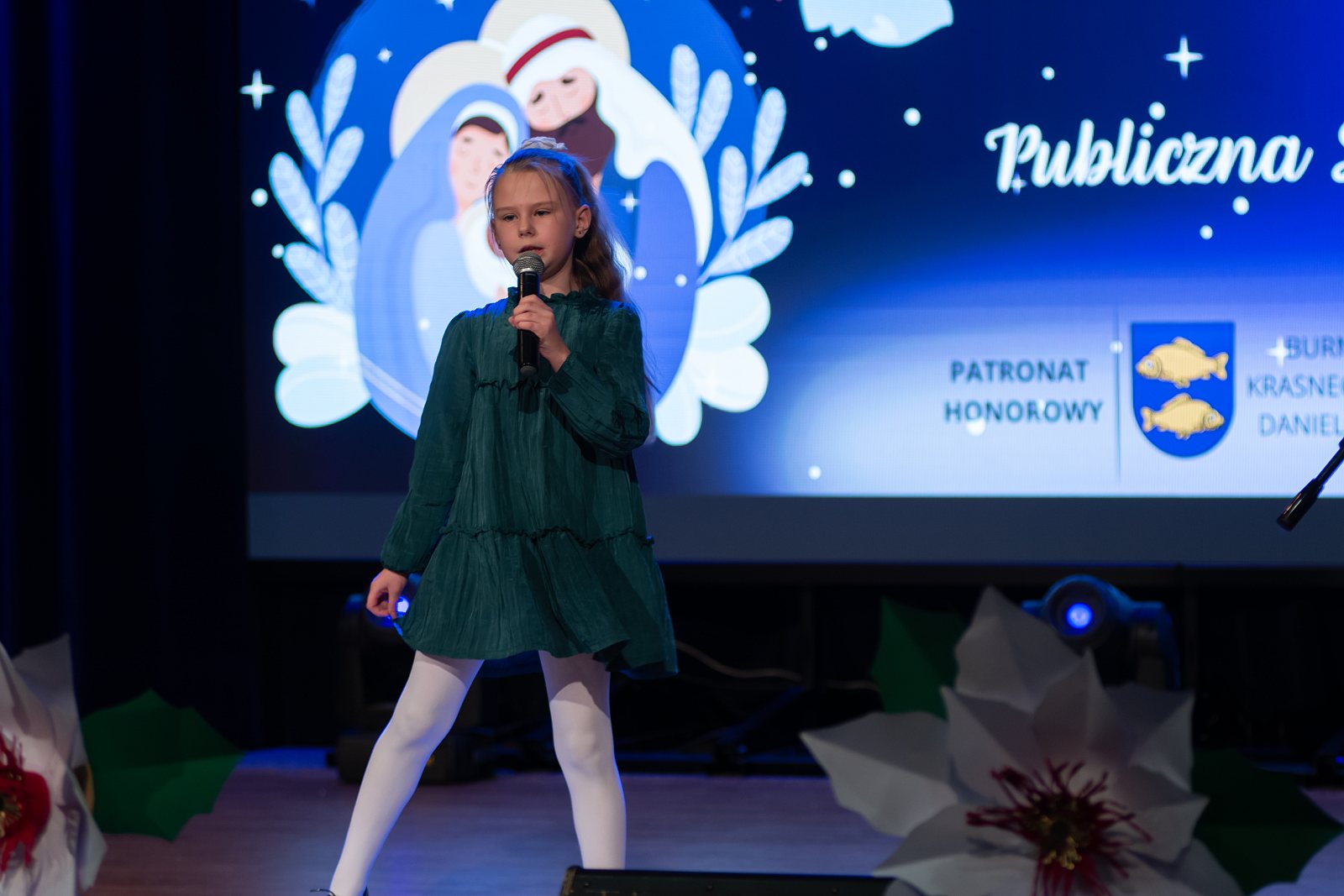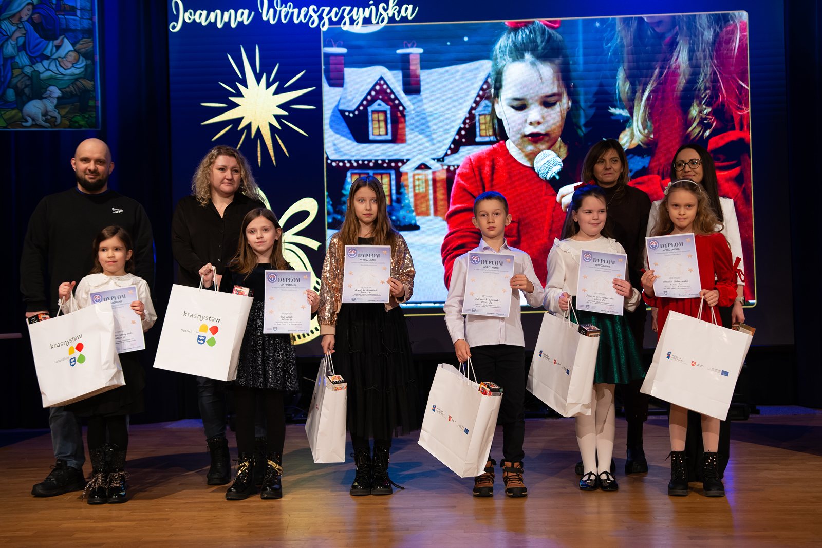 Na scenie zaprezentowali się uczniowie klas I–III krasnostawskich szkół – laureaci i wyróżnieni uczestnicy konkursu. Dzieci zachwyciły publiczność nie tylko pięknym śpiewem, ale przede wszystkim ogromnym zaangażowaniem i emocjami, jakie wkładały w wykonywane kolęd i pastorałek. Każdy występ był piękny i pełen radości, a młodzi wykonawcy z dumą i odwagą prezentowali swoje umiejętności wokalne. W imieniu Burmistrza Krasnegostawu na koncert przybyła Sekretarz Miasta – Pani Renata Stangryciuk, która przekazała uczestnikom serdeczne pozdrowienia oraz wyrazy uznania za wysoki poziom artystyczny występów, podkreślając, że sam udział w konkursie jest dla dzieci ogromnym osiągnięciem. Podczas koncertu wręczono również nagrody w Miejskim Konkursie Plastycznym dla dzieci 6-letnich „Ilustracja do polskiej kolędy lub pastorałki”, który cieszył się dużym zainteresowaniem i ukazał niezwykłą kreatywność najmłodszych uczestników. Na zakończenie wydarzenia głos zabrała Dyrektor Publicznej Szkoły Podstawowej nr 4 im. Jana Pawła II w Krasnymstawie – Pani Agata Małek, dziękując wszystkim zaangażowanym w organizację koncertu, uczestnikom oraz przedstawicielom władz miasta za objęcie wydarzenia patronatem honorowym i okazane wsparcie.
