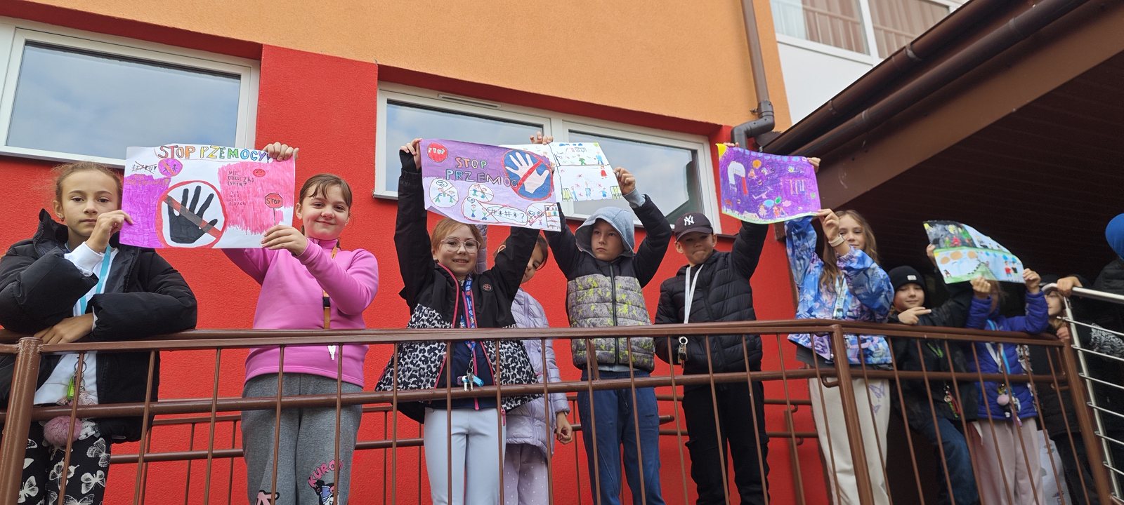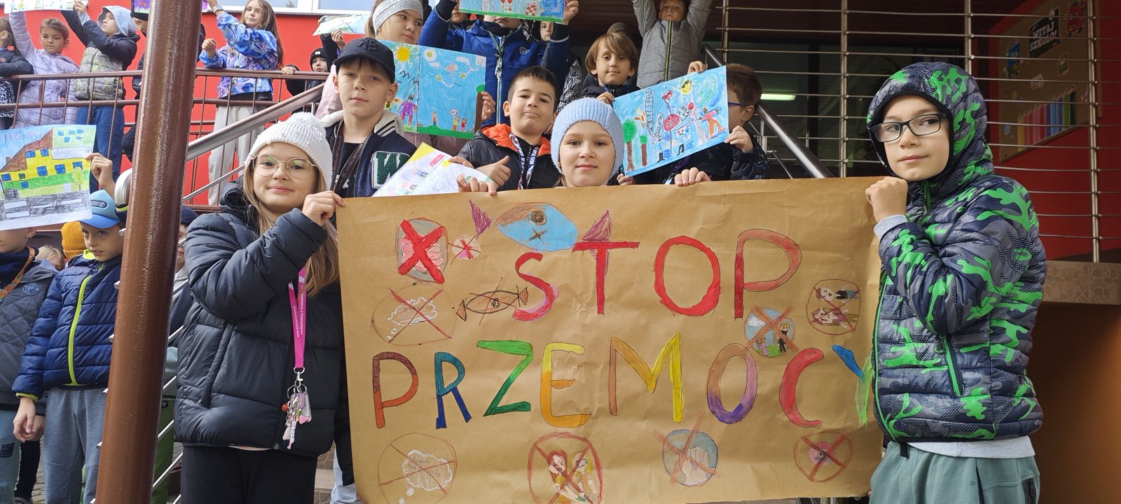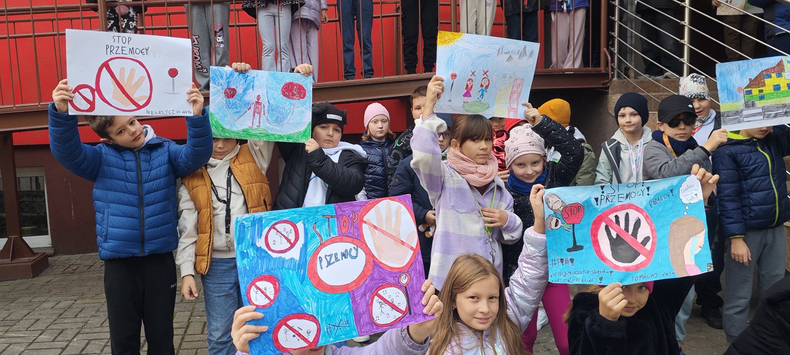 Młodsze klasy przygotowały „Dobre słowo dla kolegi i koleżanki” – pozytywne komunikaty, które zawisły na szkolnym korytarzu, tworząc wyjątkową „ścianę życzliwości”. Uczniowie klas III opracowali plakaty z hasłami przeciwko przemocy oraz zorganizowali happening przed szkołą, wyrażając swój sprzeciw wobec agresji rówieśniczej.