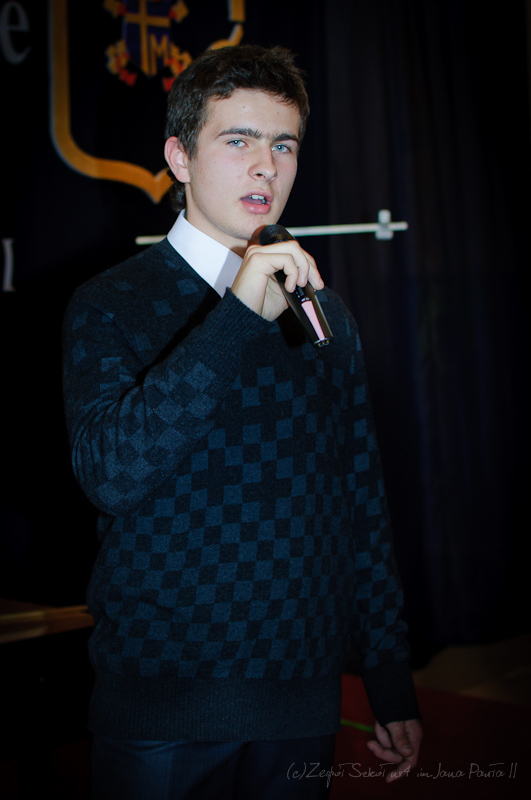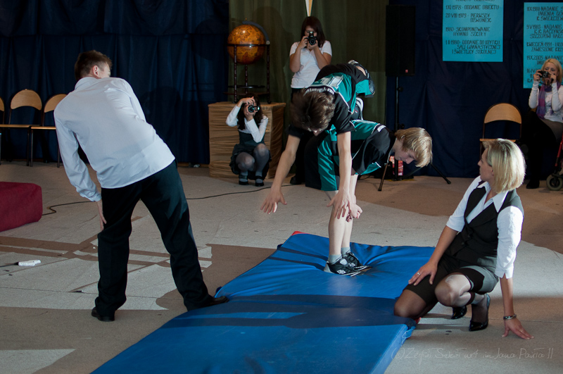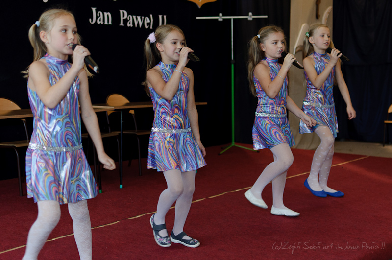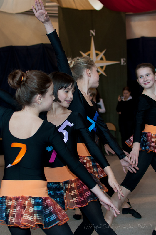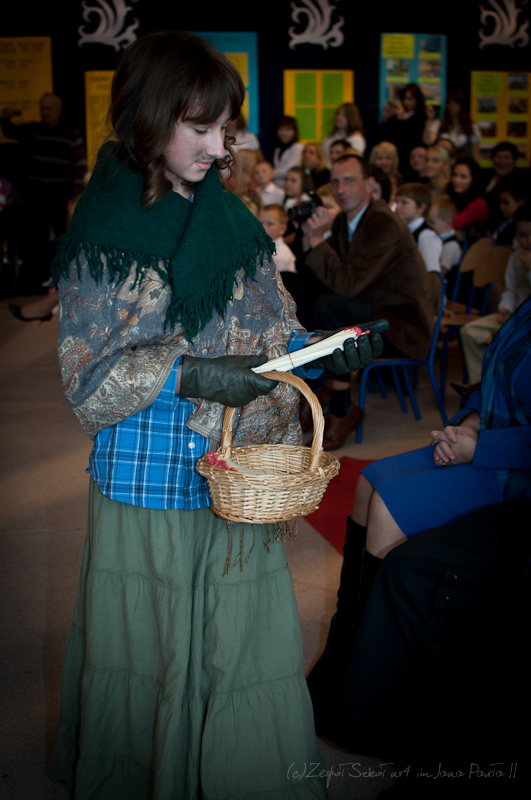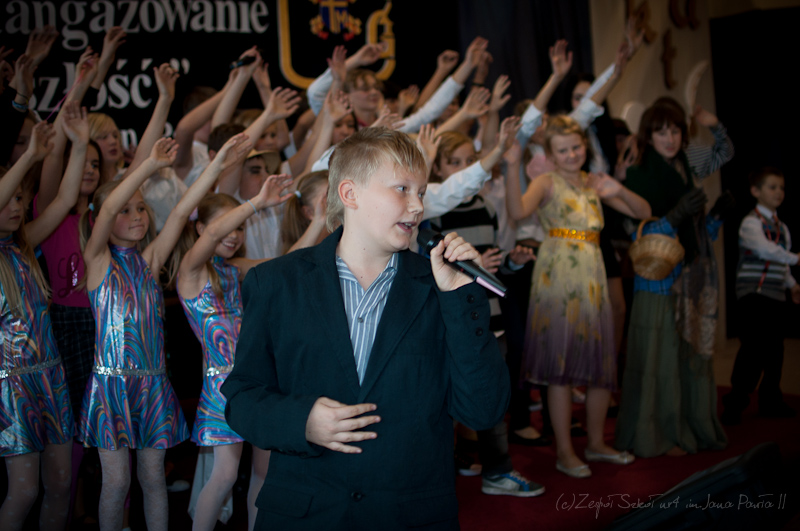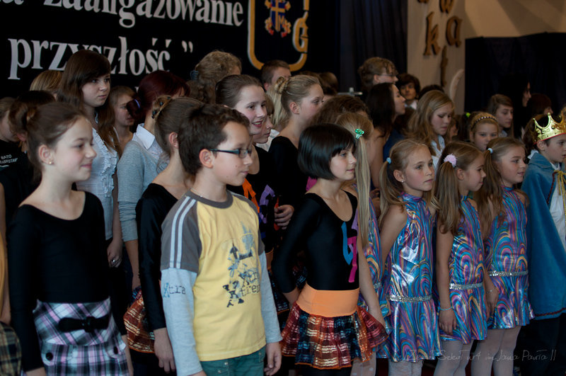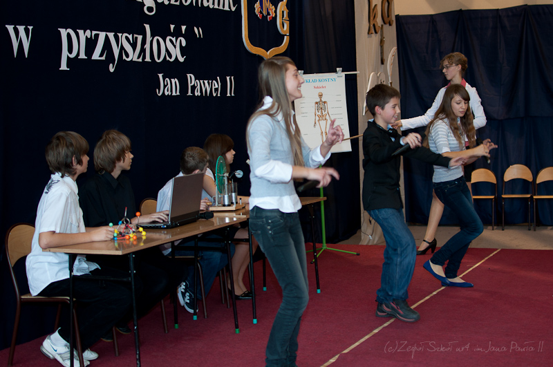 Po hymnie i wyprowadzeniu sztandarów na scenę wkroczyli aktorzy i piosenkarze. Rozpoczęła się część artystyczna przygotowana przez p. Joannę Szewczuk i p. Anitę Iwanicką. W inscenizacji udział wzięło blisko siedemdziesięcioro dzieci, uczniów klas II- VI szkoły podstawowej oraz I - III gimnazjum. Przedstawienie miało na celu ukazanie naszej szkoły jako bajkowego miejsca, w którym każda lekcja jest dla ucznia nowym, ciekawym doświadczeniem. Całość poprowadził uczeń klasy VI b, Arek Fidecki w roli Adasia Niezgódki. Na scenie pojawiali się co chwilę kolejni bohaterowie, z których każdy w swojej piosence opowiadał o ulubionym przez siebie przedmiocie szkolnym, czyli ulubionej bajce. W główne role wcielili się również Piotr Wojciechowski z klasy II b sp, Dominika Weremko z klasy III b gim., Weronika Kopeć z kl. II a, Eliza Sawczuk z klasy VI b, Justyna Mrowiec z kl. Vb Gabriel Wróbel z III b, Mateusz Marek z V b, Karolina Stasieczek z klasy III a SP oraz Ernest Markiewicz z I c. Grupę taneczną stanowiły uczennice: Martyna Darmochwał kl. IIb,Adrianna Szewczuk z kl IIIa, Karolina Stasieczek z kl. IIIa i Agata Tryksza z kl. IIIa. Każda piosenka była zainscenizowana przez uczniów w formie tańca oraz scenek przedmiotowych. Odbył się też krótki pokaz umiejętności sportowych. Kolorowa i bogata dekoracja sali, kostiumy, rekwizyty i make-up sprawiły, że całość przedstawienia nabrała niezwykłego wyrazu.