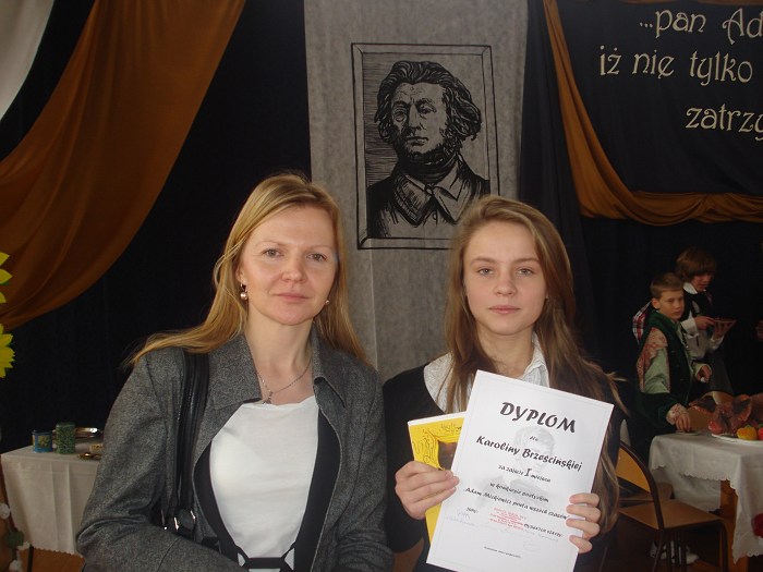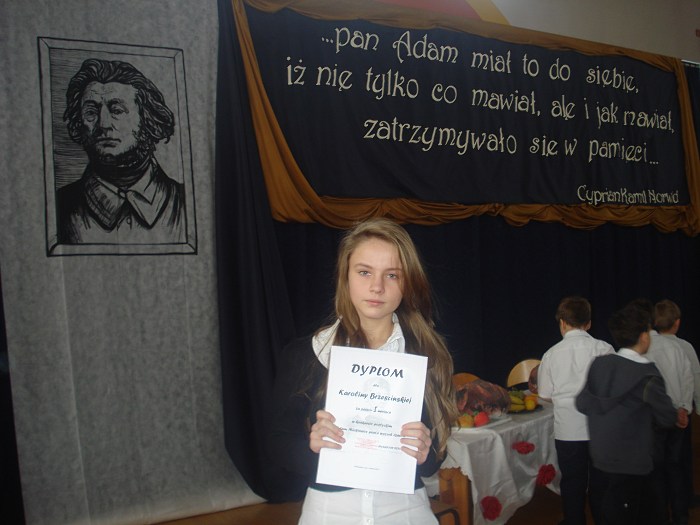 Miło nam poinformować, że w Międzyszkolnym Konkursie Poetyckim „Adam Mickiewicz – poeta wszech czasów” zorganizowanym przez Zespół Szkól nr 1 w Krasnymstawie I miejsce zajęła uczennica klasy Ib Karolina Brześcińska.