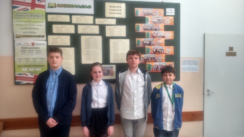 Chłopcy zostali laureatami Wojewódzkiego Konkursu Języka Angielskiego dla szkół podstawowych, gimnazjalnych oraz ponadgimnazjalnych Clickonmaniac organizowanego przez Gimnazjum Nr 5 im. Sybiraków w Zamościu pod Honorowym Patronatem Prezydenta Miasta Zamość.