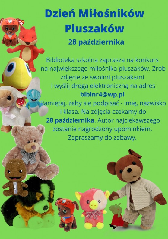 Z okazji Dnia Miłośników Pluszaków, który przypada 28 października biblioteka szkolna organizuje konkurs na największego miłośnika tych zabawek. Mogą brać w nim udział uczniowie klas I - III oraz IV - VIII. Wystarczy pokazać jak wielkim miłośnikiem pluszaków jesteś.